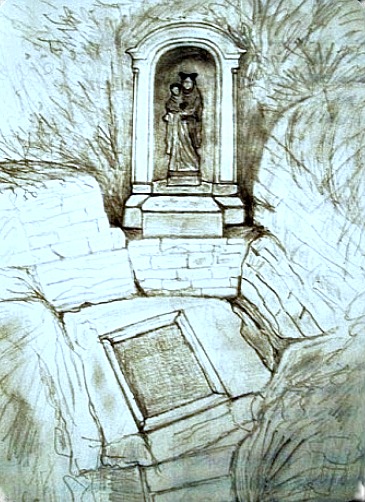 OS grid reference SD 55612 33622. Our Lady’s Well (Ladye Well) at Fernyhalgh can be reached along a narrow country lane (Fernyhalgh Lane) to the east of the A6 and M6 motorway, some 4 miles north of Preston. Fernyhalgh is a hamlet situated between the villages of Broughton and Grimsargh, with pleasent countryside on all sides. The holy well of Our Lady is in the garden of the 17th century Ladywell House which houses a Roman Catholic chapel and retreat centre. It is located at the side of the secluded Fernyhalgh Lane that runs south for about ½ a mile from D’Urton Lane. The entrance to the well and shrine is through a little gate almost hidden at the side of the retreat centre building.