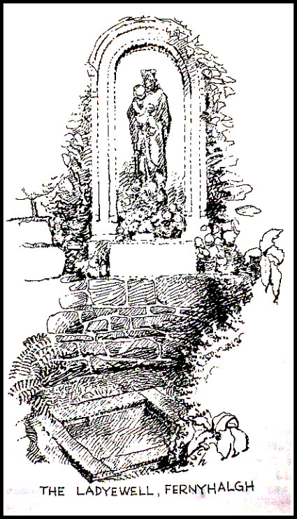 There was a chapel on this site way back in 1348 and possibly a shrine dating back to the 11th century. The spring itself is obviously a Christian one, with it’s dedication to Our Lady – the Blessed Virgin Mary, and possibly a pre-Christian spring. According to the legend, in about 1471 a merchant sailing across the Irish sea was caught in a terrible storm; afraid that he was going to drown he prayed to the Virgin Mary and vowed that if his life was saved he would undertake some work of devotion to Her. Soon the storm cleared and he found himself washed-up but safe on the Lancashire coast, but he had no idea where he was. At that moment a heavenly voice spoke to him and told him to find a place called Fernyhalgh and there build a chapel at a spot where a crab-apple tree grew – the fruit of which had no cores, and where a spring would be found. He began to search around for this sacred place but no-matter how much he tried he could not find it.