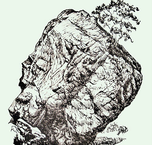 OS grid reference: NY 2540 1641. In the valley of the river Derwent, in Borrowdale, just north of Rosthwaite in a woodland clearing on the opposite side of the road from the river, stands a huge glacial boulder shaped like a human head that is one of several Cumbrian curiosities and, which has locally been called The Bowder Stone or Balder’s Stone, after the son of the Norse god, Odin (Woden). This ice-borne rock was carried down the valley by a glacier many thousands of years ago and deposited, having been trapped and then dislodged between the two side-slopes of the river valley. Today, the massive rock has become a tourist attraction and a photographer’s delight! And many antiquarian writers have travelled here to see the stone and maybe “try”and measure its height and girth, and to be amazed at this wonderous geological curiosity. The village of Rosthwaite is 1 mile south on the B5289 road and Grange is roughly one and a half miles north-west, while the town of Keswick is 5 miles in the same direction from here.