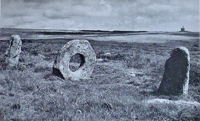 The holed-stone was obviously used for fertility rituals and, maybe even magic, and the pointed stones next to it being ‘phallic in shape’; this being borne-out through the folklore and customs of the locality and its people in ‘days gone by’. The well-known authors Janet and Colin Board in their book ‘Mysterious Britain’, 1984, say that: Many of these stones are supposed to be helpful in curing certain illnesses, and children were once passed through the Men-an-Tol when they were suffering from rickets. Stones with holes big enough to crawl through, and with similar beliefs attached to them, can be found all over the world. There may once have been some benefits to be gained from such customs, …….certain stones can hold powerful currents passing through the earth, could not the hole serve as a focus for this power, which would pass into the body of, and give renewed vitality to, anyone climbing through the hole?” Young people would come to the holed-stone in order to consult the stone (oracle) with regard to their future love life, and two pins would be placed like a ‘cross’ on top of the stone and then they would, hopefully, move in a certain way. “This was interpreted in answer to a question put to the stone,” according to Bill Anderton in his book ‘Guide To Ancient Britain,’ 1991. Young children with tuberculosis, rickets and spinal problems were passed through the holed-stone three times, while a ‘childless’ women would have to crawl through the hole nine times to receive a cure. After that, hopefully they were cured!