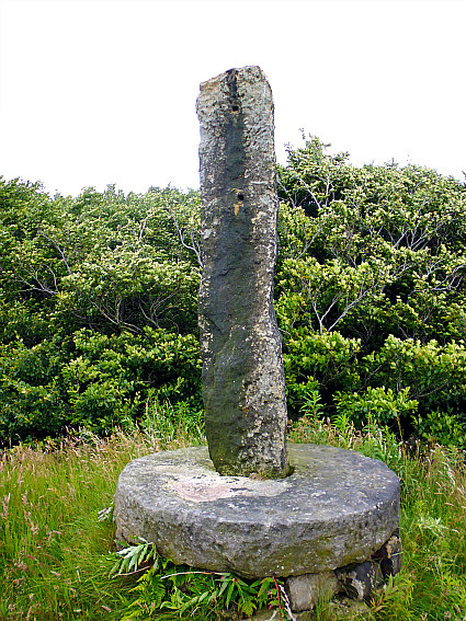 A curious stone this is mainly because of its strange shape. It looks as if it has, at some point, slid down the hillside from the rocky outcrop above on Pinfold Hill, when there was a perhaps a Geological earth movement here. Or could it be a glacial erratic boulder? But it doesn’t look like an erratic boulder to me because it seems to be very well embedded into the ground. It stands at a crazy, precarious angle and because of that it looks as if it could slither down the hillside at any moment! The large pointed stone has taken on the look of a dinosaur’s head, or could it be a dragon’s head, or a bird’s head! Some bright-spark has painted eyes and teeth on the stone to make it look like that maybe. On the flat, sloping side of the stone there are some “possible” prehistoric cup-marks, or were a few of these round holes made by climbers who often practice on the rock?