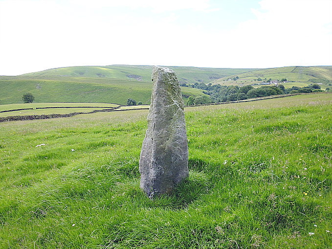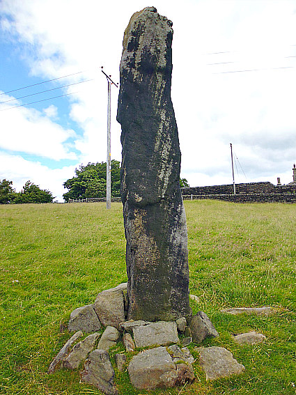 OS grid reference SE 0620 4446. A large pointed stone shaped like the head of a dinosaur, or maybe a dragon, stands below a rocky outcrop on Pinfold Hill, close to Holden Lane at Holden Gate, near Riddlesden, West Yorkshire. It is locally called ‘Robin Hood’s Stone’ but whether the legendary outlaw of Sherwood Forest ever visited it we don’t know, although there is also a Robin Hood’s Wood about ¼ a mile to the north-east of the stone. To make the stone look more interesting some bright-spark has painted eyes and teeth on it! It can be reached by travelling north along Holden Lane to the north-west of Riddlesden, and is about 450m further along the road from Holden Gate, and just after the footpath on the right. You can’t really miss it!