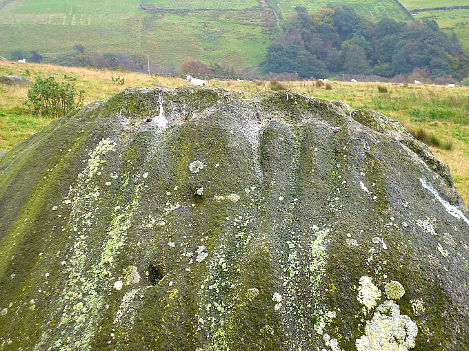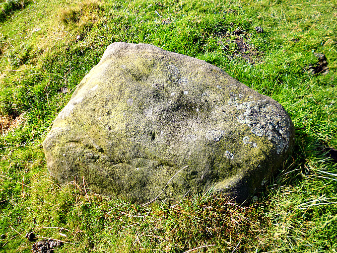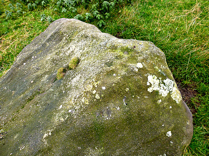 Cob Stone or Devil’s Stone is a glacial erratic gritstone rock that was deposited by a retreating glacier many thousands of years ago at the end of the last Ice Age. On top of the stone there is a cluster of 7 or 8 small cup-marks and further down a few fainter cups can just be made out. However, these faint cup-marks might have been caused by erosion – it’s often difficult to tell one way or the other, and the rock itself is now very smooth on its side due to thousands of years of weathering. Some 68m to the south-west there is an even larger boulder; maybe it’s another Cob Stone?, and this is indeed roughly shaped like a loaf of bread! This large boulder looks to have a few cup-marks on top and on its side, or are these due to erosion? And there are a few other rocks in the same field that have “possible” cup-markings; it’s just a case of walking around and looking closely at the many small and large rocks, and there are indeed “many” to look at. Cob Stone is recorded in Boughey & Vickerman’s 2003 survey.