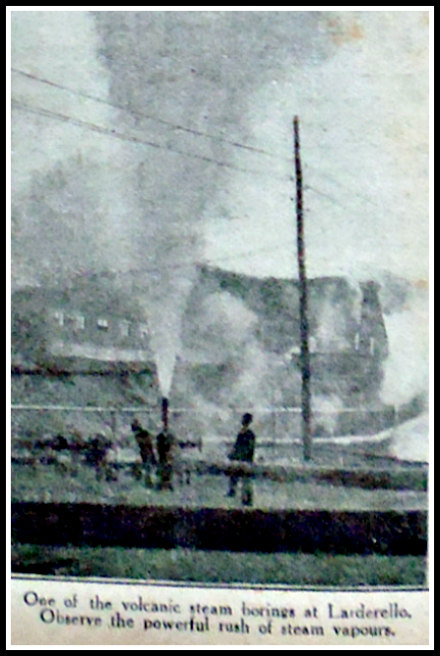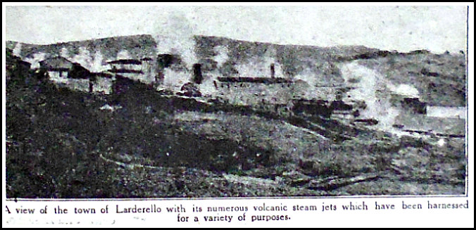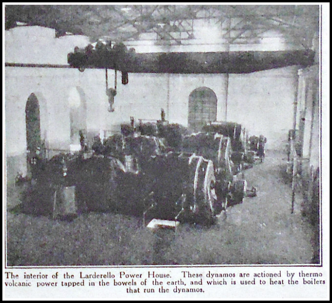 “The power-houses were soon supplying hydro-volcanic energy to a considerable number of factories, and in what was formerly a deserted district there sprang up the town of Larderello. Not only so, but there ensued the natural desire to turn this volcanic power to domestic use, and some of the engineers and factory managers had their dwellings fitted up with piping, so as to get heat in winter and fuel for cooking, for the heat is sufficiently great to bake a joint in an oven in half an hour. It is, however, dangerous to “monkey about” with the subterranean forces of Nature, and early experiences were accompanied by a number of accidents and mishaps.