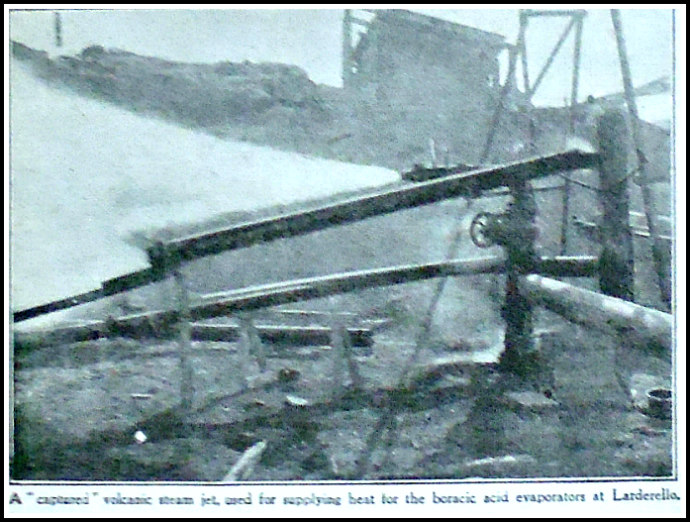 “The district of Pisa, in Tuscany, is largerly of volcanic origins. In some parts of the province, and more especially in the neighbourhood of the little town of Larderello, the boiling  springs which exist in the subsoil issue to the surface in the form of numerous and powerful “gushers” or “geysers” of hot  vapour or steam. These gushers, or jets of steam, are known locally as “saffioni,” and the evaporated steam finds its way into a large number of small pools or “lagoni.” Though these jets of steam issuing through fissures in the granite, must have existed for many thousands of years, it was not  until about a hundred years ago that they were discovered to contain a substance of great commercial value. Some scientists visiting the pools, or “lagoni,” found out  that the waters contained, in a state of dissolution, a very considerable quantity of boracic acid. It was soon discovered that the boracic acid came from the jets of steam issuing from the soil near by, and, provided means could be invented to evaporate the waters of the “lagoni,” the boracic acid would fetch a good price.