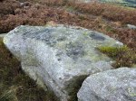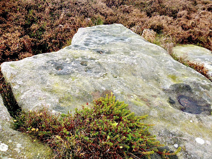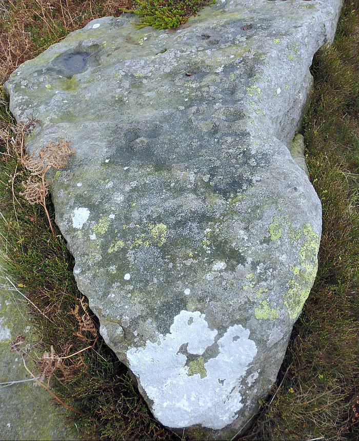 OS Grid Reference: SE 13468 46176. Fish Stone is a cup-marked rock on Ilkley Moor, in west York-shire, located close to Pancake Stone, and on the footpath that runs along the ridge high above Hangingstone Lane and the Cow & Calf Hotel. For want of a better, proper name, which it might have, but at the moment I can’t find it – I have given it the name: ‘Fish Stone’. However, I “now” know it to be called ‘Pancake Ridge 14’ because it is to be found on that ridge of high ground and opposite the curiously shaped ‘Pancake Stone’, which also has some cup-markings on its top surface. The stone is, at a certain angle, shaped like a fish though I’m sure there are other rocks on the moor that bear that same similarity. The stone has been recorded by Boughey & Vickerman as (338) and by Era as (Era-2564). For directions to the Fish Stone (Pancake Ridge 14) please see the site page for ‘Haystack Rock’: https://thejournalofantiquities.com/2017/10/27/haystack-rock-ilkley-moor-west-yorkshire/