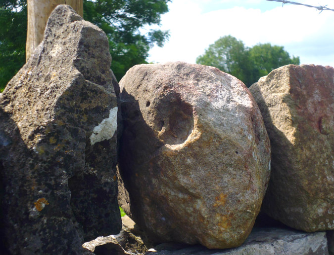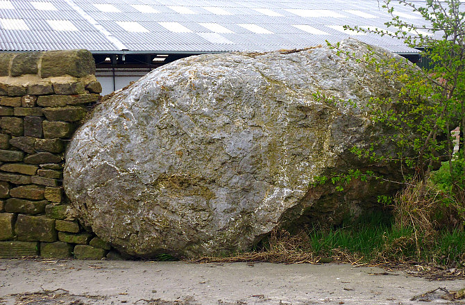 The second stone is located a little to the southwest at (NGR: SD 8847 4802) and is on the top of the wall further along on the op-posite side of the lane. This is a smooth round-shaped stone with   a well-pronounced circular hole, but whether it is a cup-mark carving is uncertain. It could be a hole left by a fossil that has dropped out, or it could be some Geological feature? At certain angles though it does look like a prehistoric cup-mark. Whatever it is, it is a very interesting stone. There are other round-shaped stones along the top of the wall. The large glacial erratic boulder (mentioned earlier, above) is between 4 and 5 foot high, and was dug out of the boulder-clay (10 foot deep) by a 13 ton digger when the new farm building (where the cows are milked) was under construction, and had not seen the light of day since the last Ice Age. The smaller boulder (in front of the farmhouse) was probably dug out of the ground around the same time. Greenberfield lies within ‘the Craven lowland drumlin field’, according to Nick Livsey.