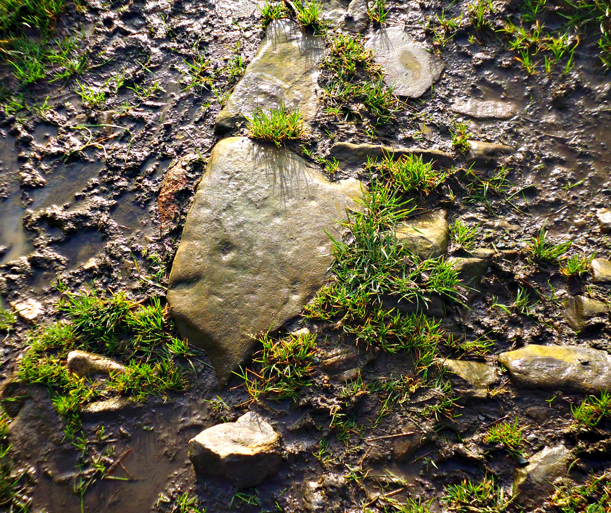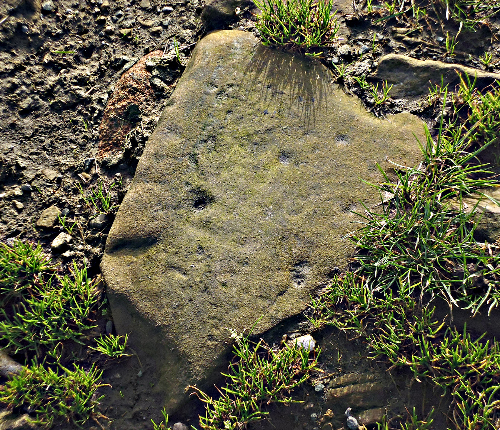 NGR: SD 8909 3701. At the edge of a field beside Delves Lane, near Nelson, in Lancashire, there is a flat, shaped stone on the ground that looks to have “possible” ancient carvings on it. This smooth, strangely-shaped, and worn, rather innocuous-looking stone, is to be found at the edge of a farmer’s field and just inside a metal-gated entrance, and not more than a metre away from the country lane that is over-shadowed by the ancient Walton Spire monolith, over to the north. The stone has one well-defined cup marking and three more tiny, weathered cup markings on it, and also fifth and sixth cup marks together at the far side of the stone. It measures 16 inches long by 12 inches at its widest. All in all though this is a very nice stone; but it is a few miles ‘as the crow flies’ from the moorland where most of these petroglyphs would usually be found.