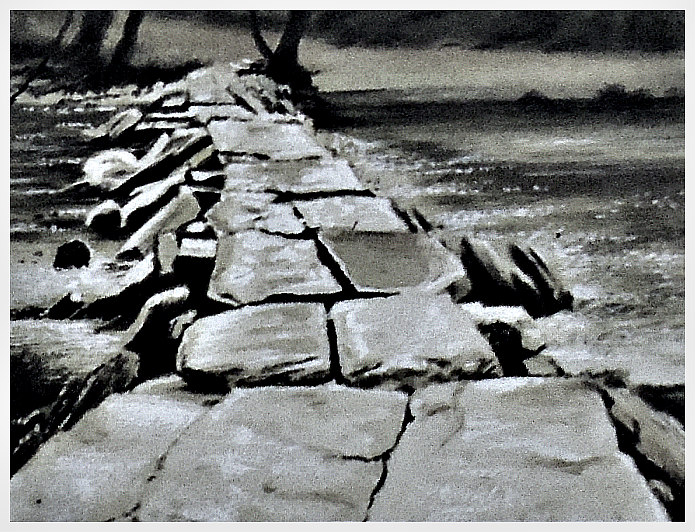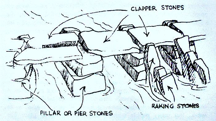 “Description Of Steps Back from the wilds of Exmoor let us return to Dr. Sweetapple’s Guide and a description of the Bridge, which consists of 17 spans, the covering stones laid flat without mortar or cement of any kind, on pillars of rough stone placed directly on the river bed. The pillars are from 4ft to 6ft apart, 3ft to 4ft high and about 3ft in breadth. Most of the pillars are spanned by one stone only but some have two laid side by side and one has three. The great slabs are from 6ft to 8ft long. One is over 10ft in length, nearly a foot thick, and estimated to weigh two tons or more. One stone about the centre of the Bridge is laid crosswise and is said to mark the boundary between the Parishes of Dulverton [now Winsford] and Hawkridge. This last mentioned stone seems to have been left out in one of the later reconstructions.