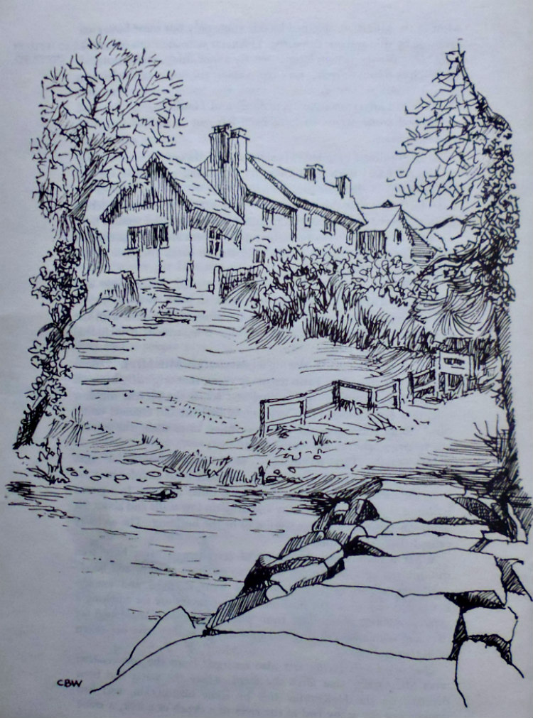 “At each pillar a long stone is slanted lengthways, one end resting on the river bed with its higher end projecting just above the flat stones of the bridge (the present writer’s theory on this aspect of the construction is that this was to allow tree branches and other debris to slide up the sloping stones in times of flood and be washed over the flat stones rather than pile up against them and risk damage to the bridge). The sloping stones were also to break the force of the water against the pillars. The Bridge is 180ft long according to Dr. Sweet-apple and Grinsell, but the actual length from bank to bank, is about 135ft. The discrepancy is accounted for by the stones lying flush with the surface of the ground on the Hawkridge side, which, if included, come to approximately 180ft. The writer discovered, during a conversation with Mr. A. Oakes, who was tenant of Tarr Farm for many years, that originally a branch of the river ran under these stones and across the present meadow leaving a large island. Dr. Sweetapple had the old channel under these stones and across the meadow, filled in to make the present much larger and more useful field.