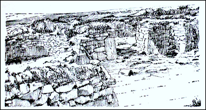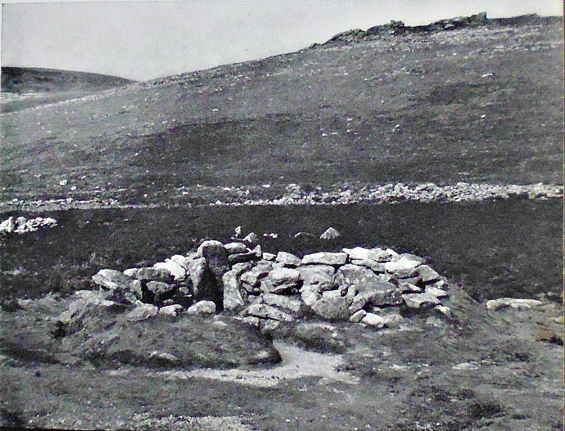 On all sides of you as you walk in the houses of these forgotten folk, with their graves and the large monoliths which are supposed to have marked their temples. As you look at their grey stone huts against the scarred hillsides you leave your own age behind you, and if you were to see a skin-clad, hairy man crawl out from the low door, you would feel that his presence there was more natural than your own.