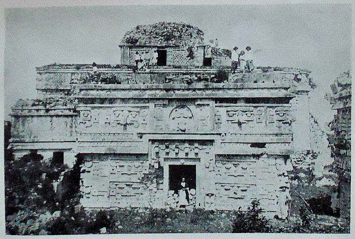 “The other buildings standing to-day at Chichen Itza are: the Akad-zib (‘“House of Mysterious Writing”’), which gets its name from a series of Mayan hieroglyphics over the doorway; the Chichanchob (‘“Red House”’), in allusion to the remarkable, possibly symbolic, decorations on the interior walls, which take the form of a hand painted in red, which design is, curiously enough, found also in parts of Asia; and a small building close against the Casa de las Monjas.”