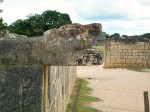 “To the south-west, one hundred and thirty yards from El Castillo, is what is now known as the Tennis Court. Running north and south are two parallel walls twenty-five feet high, thirty feet thick, two hundred and seventy-four feet long and one hundred and twenty feet apart. The court was used for a ball game of which the ancient Maya were very fond. It was played by teams whose object it was to get a ball made of rubber through a hole in a stone disc jutting out from the upper part of the wall.
