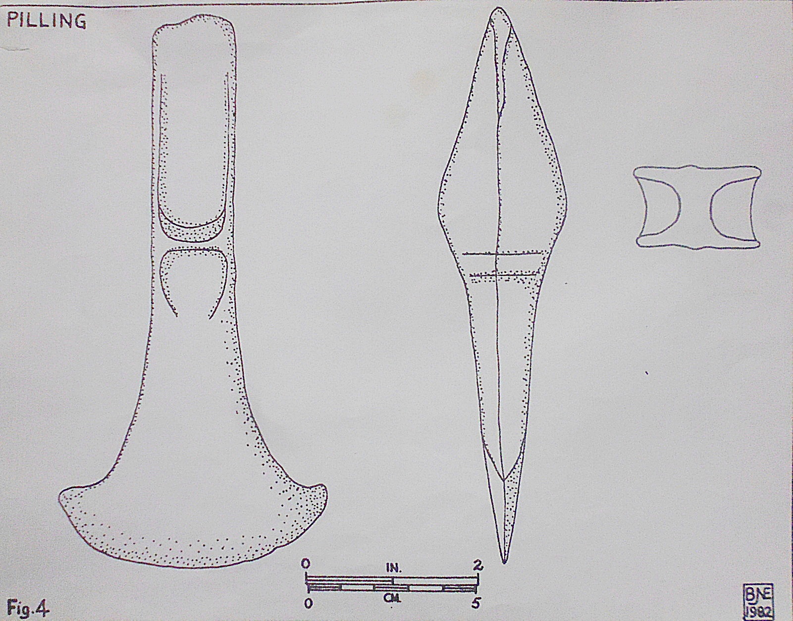 B. J. N. Edwards writing in 1982 says: “Readers will recall that the original stimulus for the excavations at Pilling in 1978 and 1979 was the finding of a Bronze Age haft-flanged axe blade. Subsequently, another was found in the same area. These two blades took their places in a line of five similar discoveries running NW-SE through the excavation site. These were then the only Bronze Age axe blades recorded from the Moss apart from a single flat axe. It is a palstave and was found during drainage work in the winter of 1980-81 near Eagland Hill.