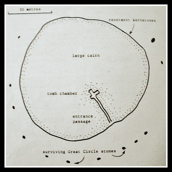 “The eastern chamber was much more ambitious in construction, especially in the width to be spanned and in the weight of the capstone that was raised into position. It was found necessary in 1961-62 to provide additional support for this great roofing stone and a buttress was built on either side of the chamber for this purpose. This chamber stands some 28ft east of the other and is itself some 12ft long, splaying in width from 5 to 7ft. A low cross-slab with broken upper edge should be noted near the eastern end within the chamber. This may have stood to a greater height, thus acting as a partial closing stone. The gap between its free end and the southern side of the chamber was found to have been filled with blocks. A gap towards the rear in the walling of the north side of the chamber may have been intentional as it was spanned only by small flat slabs and no socket for a missing upright came to light. Eastwards of the cross-slab, the projecting walls of the chamber provided a kind of covered portico; then there was an open area bounded by small uprights of various heights, more or less continuing the shape of the portico. Finally, all this area the cross-slab outwards was sealed up with a massive blocking of sloped slabs and cairnstones.