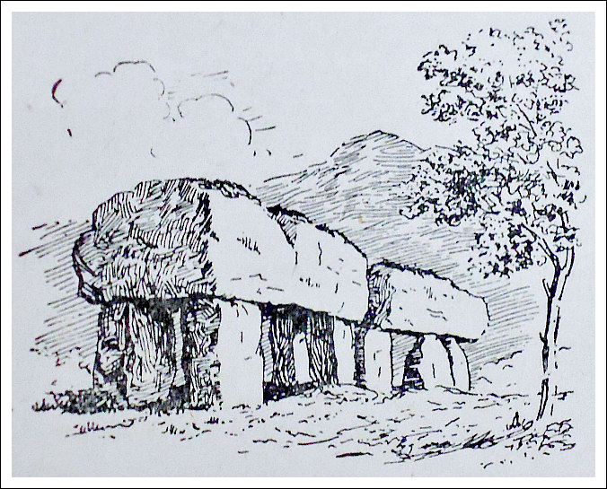 OS Grid Reference: SH 5887 2284. Neolithic monument consisting of two independent burial chambers stands in a field, 200 feet above sea-level, at the east side of Dyffryn Ardudwy village, Gwynedd, on the western slopes of Moelfre Hill which rises to 1932 feet. Dyffryn Ardudwy is 5 miles north of Barmouth. The ancient monument from about 4000 BC is also known as a ‘chambered cairn’, ‘portal dolmen’ and ‘cromlech’; it goes by several other names including Arthur’s Quoit, Carreg Arthur and Coaten Arthur. These megalithic burial chambers or dolmens can be reached by way of a lane running east off the A496 (coast road to Harlech) just before, or after Bro Arthur, depending on which way you are walking, and then by a short footpath into the fields (passing close by the village school) for maybe 100 metres east of the village. It is marked by a large cairn of stones spread widely about and two burial chambers that are set-apart, each of them having upright slab-stones and huge sloping capstones.