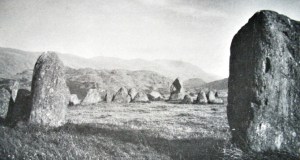 NGR NY 2913 2362. Castlerigg stone circle or the Druid’s Circle stands on a flat hilltop close to Castle lane, just south of Goosewell farm, 1 mile north of the A591 at Castlerigg village and 2 miles east of Keswick. Although referred to as a circle, it is actually oval in shape and probably dates from the late Neolithic to the early Bronze Age periods 3,370-2,670 years BC. There are some excellent panoramic views to be had from the circle of the distant mountains of the lake district.