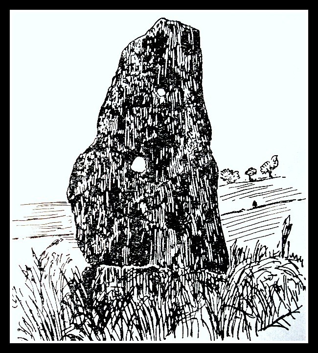 This strange looking stone which seems to change it’s shape when viewed from different angles, from being thin to rather stocky, stands at 7 feet tall and is said to date from the Bronze-Age, more than 2,000BC. It has two naturally-formed round holes, but how these were made in the first place is open to question? They may have been made by the weather wearing away vulnerable parts of the stone or, are they, perhaps, connected with some local fertility rituals that took place here long-ago. The stone has suffered some damage over time due to it being used as an animal scratching post!