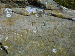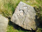 NGR: SD 9076 3457. Rieve Edge is a steep hill overlooking Thursden Valley at the north side of Extwistle Moor, in Lancashire. At its summit is an outcrop of Gritstone rocks with more rock debris on its lower flank, down as far as the Pennine Bridleway, which skirts the lower side of this hill. On one of the large flat rocks on the lower slope of Rieve Edge there is a large carved cross which is “possibly” Medieval, or could it be more recent? And on another rock a bit further up the hill there is a carving of a head with a helmet and some letters; this particular carving being more recent though. There don’t appear to be any prehistoric carvings on the rock outcrop though there are erosion-related holes in some of the rocks. There is a stone with a single cup-mark beside the bridleway. No designated footpath goes up to Rieve Edge from Ridehalgh Lane, in Thursden Valley, so it’s just a case of climbing up the steep hillside with the rock outcrop up ahead of you, but it’s worth the climb just for the views!