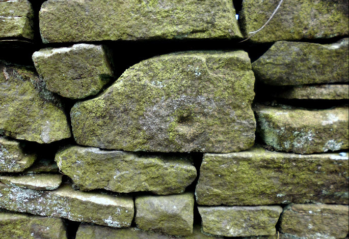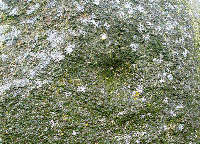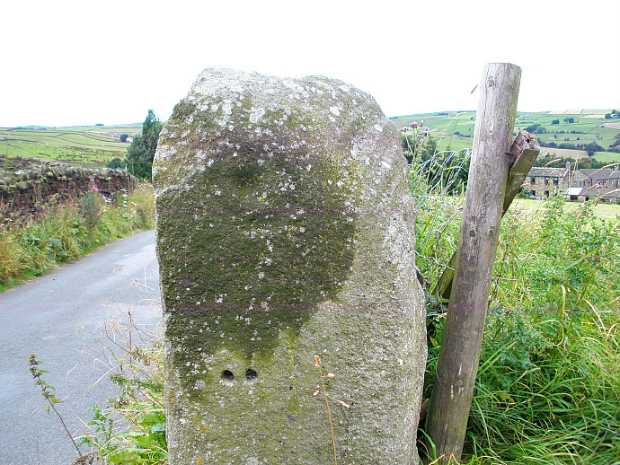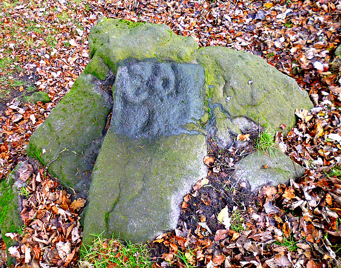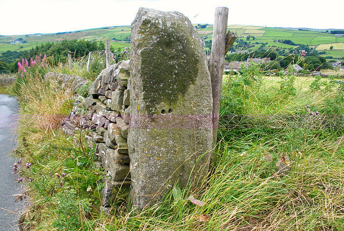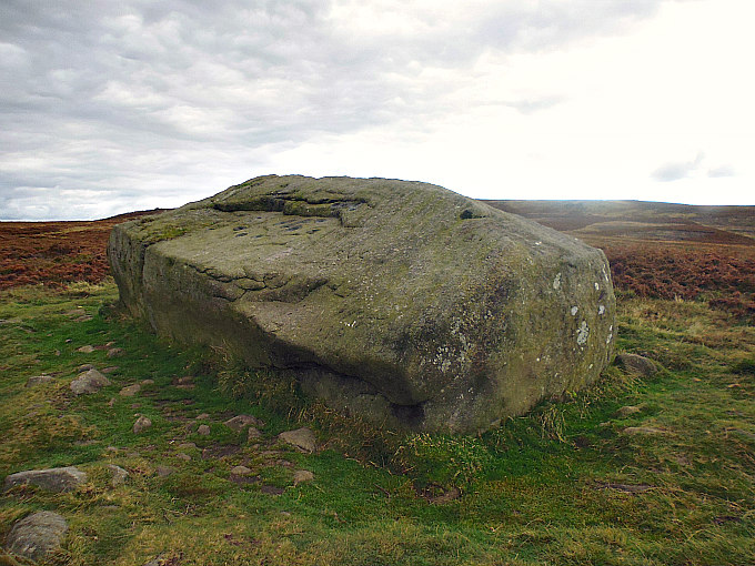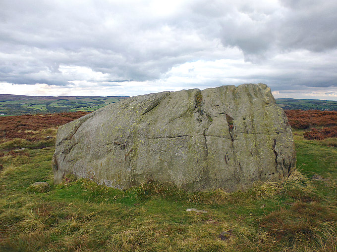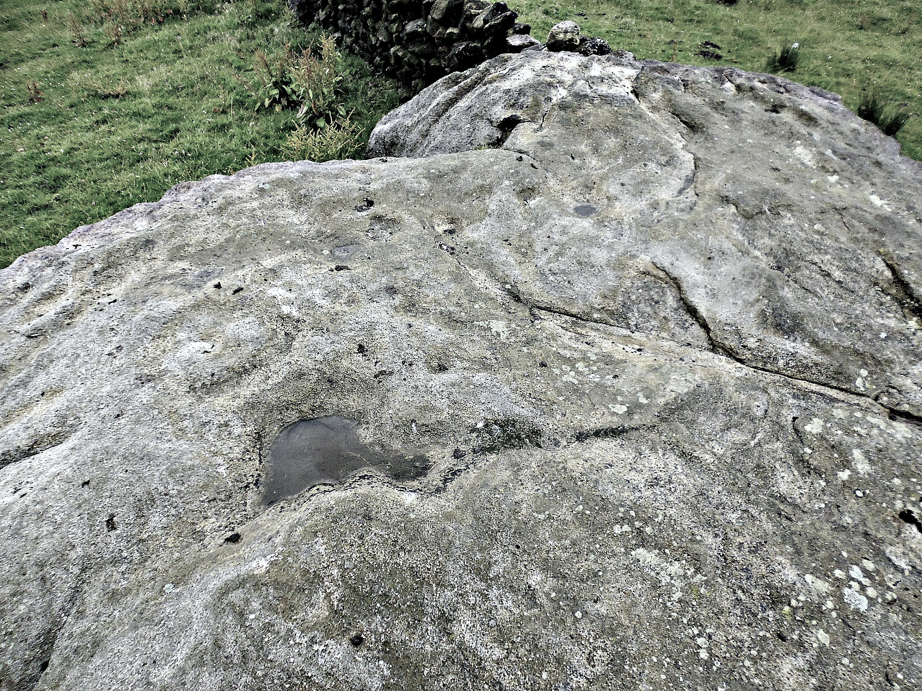 William Walker’s Stone is around 6 feet high and lies on its own here against a drystone wall. There are, though, other similar earth-fast rocks and boulders over to the east at Greystones and, further to the north on Sutton Moor, there are the Buck Stone, Hitching Stone, Kid Stone and Quicken Stone. But William Walker’s Stone is the only stone of those to have definite prehistoric cup-and-ring markings, which are also known as petroglyphs. There are said to be perhaps up to twenty cup-markings (circular depressions) on the top of the stone and a very worn ring can just be made out next to a small and shallow rock basin. The partial ring has several cup-markings around its edge and within it, which almost make it look like a face. There are maybe a few other cups with rings in a line on the upper side of the rock, though these might be more recent. There are also some curious grooves on the top of the stone but these might be naturally-formed features caused by weather-related erosion. The Northern Antiquarian discovered the rock carvings on William Walker’s Stone back in 2006, and, they also noted what might be a boundary mark with the letters “I W”, although the stone does not appear to have ever marked any such boundary!