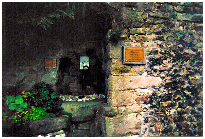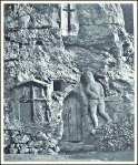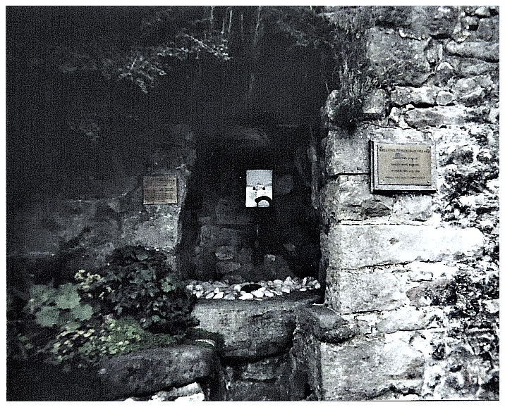 About ½ a mile to the west, at the other end of Abbey Road, is the medieval chapel of ‘Our-Lady-of-the Crag’, which has sometimes mistakenly been called St Robert’s Chapel, but this folly-like structure was built 200 years after the saint. The chapel, with its tiny inner shrine, was carved out of the sandstone rock-face in c1408 by a local mason by the name of John, whose son was almost killed in a rock fall. John prayed to Our Lady for a miracle. His son survived, and to thank Our Lady for the miracle he built the Chapel in thanks. The inside of the chapel is very tiny but there is an altar and a lovely modern statue of Mary. It has a carved vaulted ceiling with bosses and gargoyles. Church services do still occasionally take place at the chapel and groups of pilgrims come on visits (see the St Mary of Knaresborough website, below, for more informa-tion). By the chapel’s entrance and ‘standing guard’ is an 18th century carved statue of a very life-like knight in armour holding his sword. The chapel is Grade I Listed.