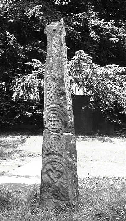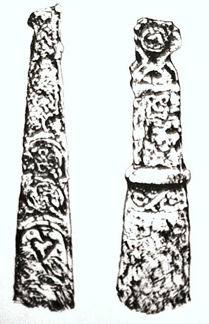 The smaller of the two crosses is described as traditionally Mercian in style. It stands at 4 feet 3 inches high and is a cyllindrically-shaped pillar with very little of it’s round cross-head surviving, having suffered from vandalism, although a small boss can still be seen. A raised collar runs around the middle with some raised links running downwards forming a square. The rest is now well-worn and difficult to identify. When it was examined just below ground in 1890 by Rev G.F.Browne it was found to be standing in a rude-stone socket. The second cross over 5 foot high is the more normal Anglo-Saxon thin pillar-shaped cross that has been restored in two places – again due to vandalism. The cross-head has long since gone. However, this cross still displays some interesting carvings, including a scroll or circle, knotwork interlacing and at the bottom what could be the top part of a human figure is portrayed in a rounded panel. Both crosses date from between the 8th and 11th centuries AD.