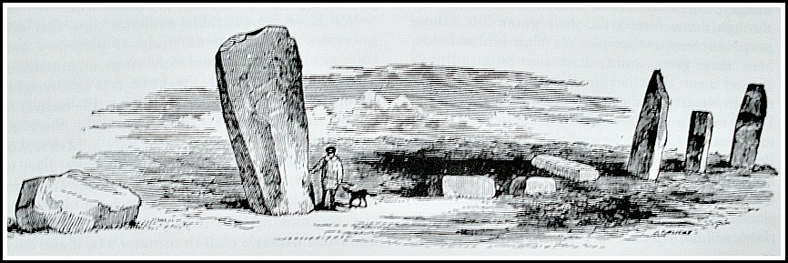 What is left of a once quite spectacular row of up to 160 standing stones, also known as orthostats or megaliths, dating from the Bronze-Age, lie scattered about at the roadside and are easily overlooked. Two quite large stones stand in the banking at the roadside, while others close by have fallen over and one or two others have, sadly, been made into gateposts. They range in height from between six foot and 9 foot high, with the tallest 12 foot high. An eighth stone is now missing, probably robbed-away to the local area and built into a wall somewhere close by. The field opposite is called Parc y Meirw “the field of the dead” and is thought to be where a Dark Age battle took place and where many warriors died, or according to some, they were turned into standing stones – a row of stone warriors, perhaps; the stones being placed here to commemorate those that fell in some bloody battle back in the mists of time. But in theory the stones pre-date the Dark Ages by thousands of years. There are another two standing stones further along the road in the direction of Trellwyn, most likely the end of the stone row.