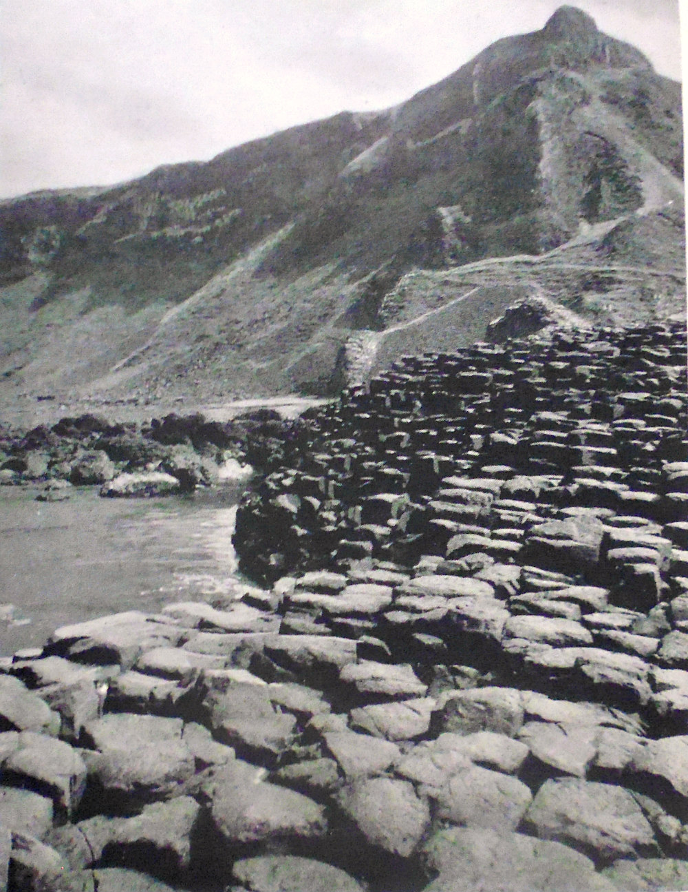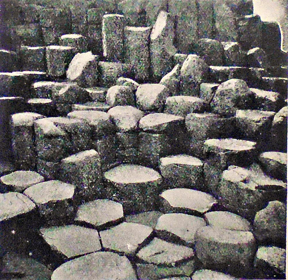 “It would be impossible within the limits of a short paragraph to do justice to the strangeness and poetry of the Giant’s Causeway. It is a honeycombed series of beaches without a grain of sand, flanked by the ruins of two castles, Dunseverick and Danluce, situated high above the sea on isolated crags. Nor must the Carrick-a-Rede be forgotten, that lonely rock island in the path of the salmon shoals. To reach it during the season fishermen sling a rope bridge be-tween it and the mainland, eighty feet above the roaring waves. A photograph gives but a passing impression of what is surely one of the unique spots on our globe. Unfortunately it cannot do justice to the whole range of wonderful beach, for the very simple reason that no two spots resemble each other, but are as varied in form as are the legend or romance atta-ched to each. The size of the columns and pyramids varies likewise, some attaining a height of thirty feet. Now they are close-fitting, forming a level tessellated floor, now loose and irregular.