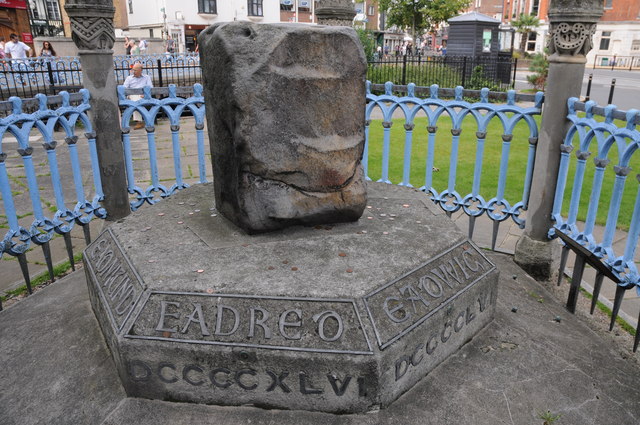 OS Grid Reference: TQ 17867 69069. On High Street, just opposite the Guild Hall, in the town centre of the south London suburb of Kingston-Upon-Thames, Greater London, is the 10th century stone monument known as ‘The Coronation Stone’ or ‘The King Stone’. Traditionally seven, or maybe eight, Anglo-Saxons kings (AD 900-1016) were crowned whilst seated upon the stone. This 3½ foot high block of grey-black sarsen stone ‘now’ stands on a grassy area of land close to the Hogsmill River, and is surrounded by ornate blue Victorian railings. The Greater London suburb of Kingston-Upon-Thames, once part of Surrey, obviously taking its name from the stone that has, from an early date, also been called the King Stone or King’s Stone. Originally it stood in the ancient Chapel of St Mary (which had fallen into ruin by 1730) and, in 1850 the Market Place, but in 1936 it was moved to its present position on the High Street; though it could be moved again in the near future to All Saints Church, a building which also has ancient origins.