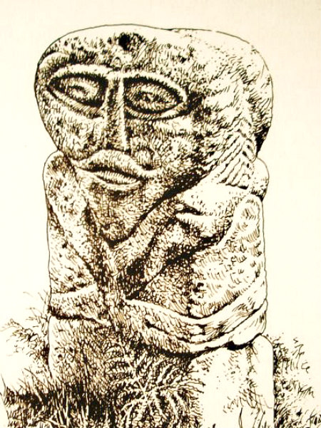 The Rough Guide (1999) tells us more about: “This ancient Christian burial ground of broken moss-covered tombstones, shaded by low, encircling hazel trees, has an almost druidic settting. Here you’ll find the Janus figure, an idol of yellow stone with very bold symmetrical features. It has the phallus on one side, and a belt and crossed limbs on the other. The figure was probably an invocation of fertility and a depiction of a god-hero — the belt being a reference to the bearing of weapons. Alongside it stands the smaller “Lusty Man”, so called since it was moved here from nearby Lustymore Island. This idol has only one eye fully carved, which may be to indicate blindness — Cuchulainn had a number of encounters with war goddesses, divine hags described as blind in the left eye.”